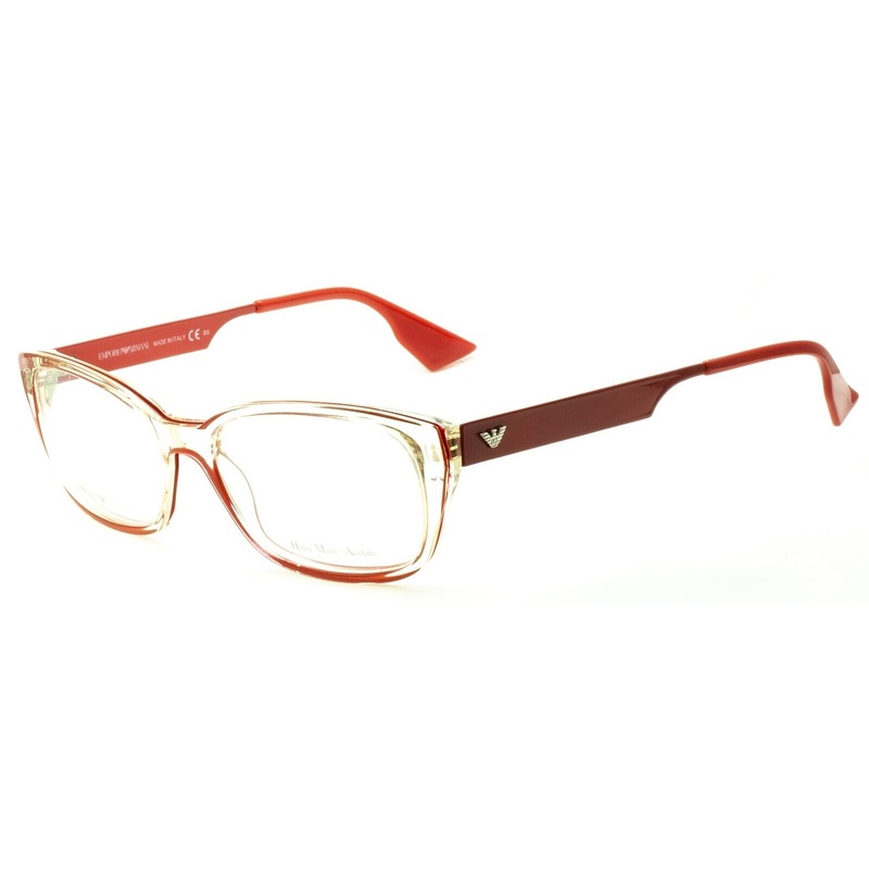 EMPORIO ARMANI Full Rim Frames100% Authentic -EA 9667UTBGloss transparent crystal acetate frames, red stripe aroundPolished red metal arms with raised EA logosGloss red acetate arm end coversBrand new - Never been wornLens Width = 53mmFrame Height = 39.5mm