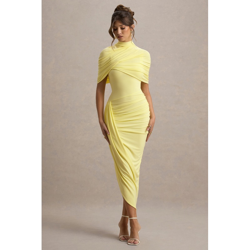 Sophistication and glamour at its finest with our Enchant Maxi.Cut in our premium stretch jersey in a bold shade of lemon, this dress will flatter your figure from every angle. The high neckline and cape sleeves make it the perfect piece for an elegant occ