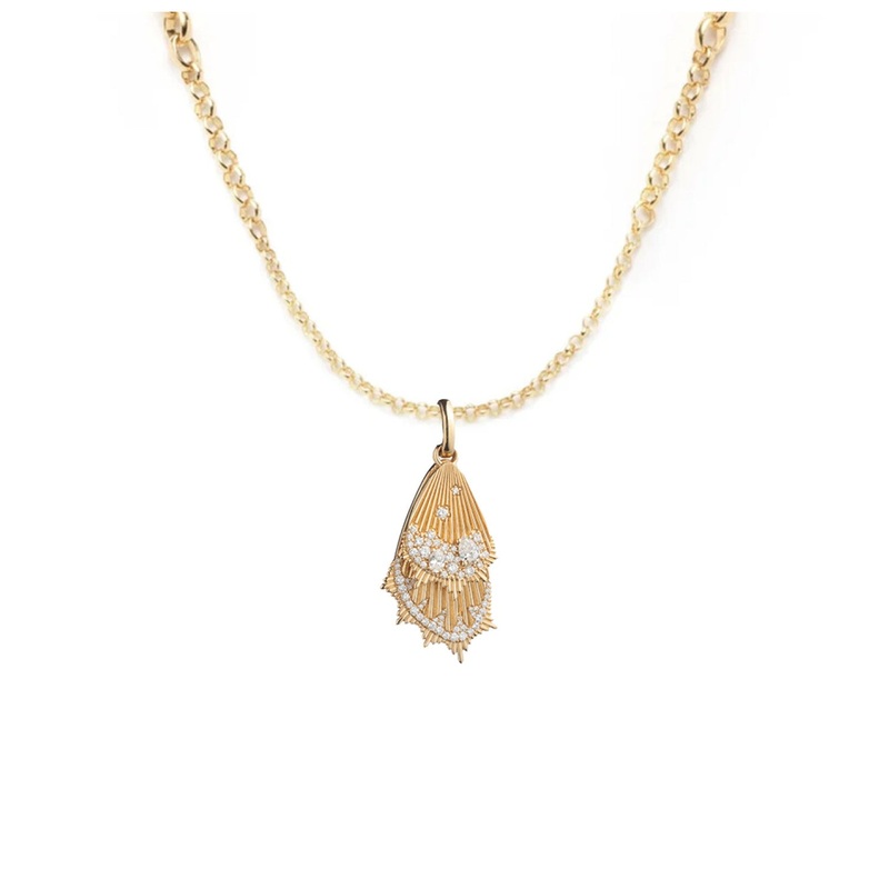 Handcrafted in 18-karat yellow gold, the Encrusted Butterfly Wings Graduated Belcher Necklace represent Reverie and the Soul.