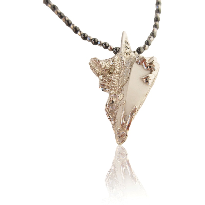 The Ephesus Necklace is a sensual white gold pendant,set with recycled white porcelain and 0.1 carat black and coloured diamonds on ahematite and silver faceted hematite beaded multi wrap necklace.Part of the Amazonian Collection by Imogen Belfield. This f