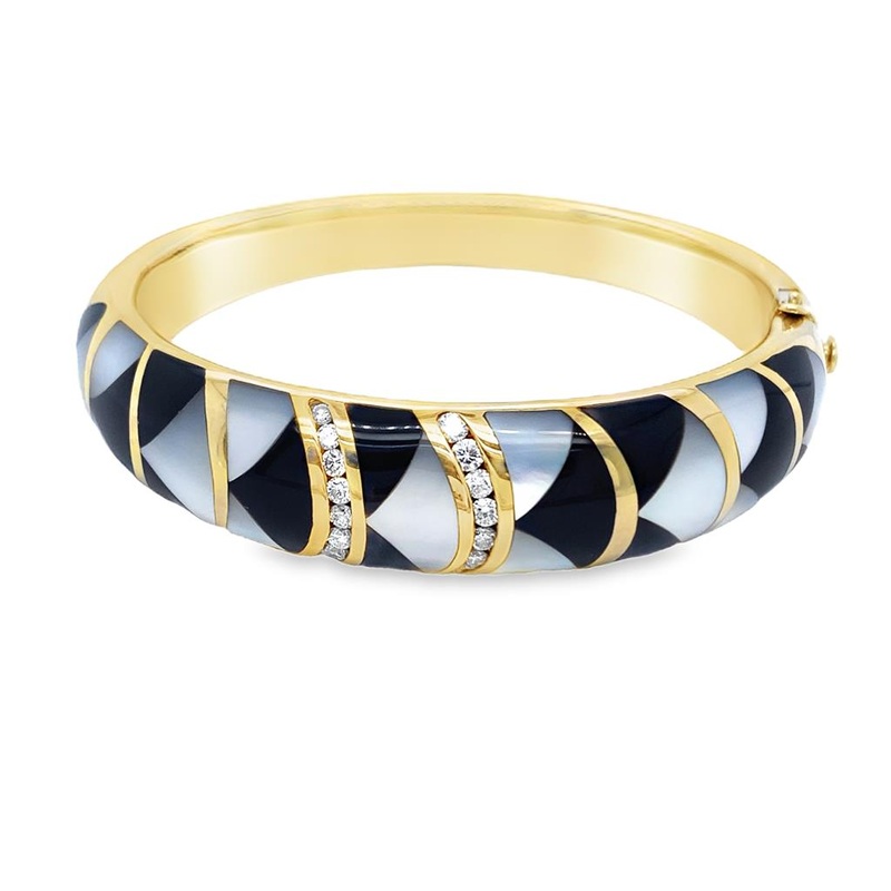 Estate 14 Karat Yellow Gold Asch Grossbardt Onyx And Mother Of Pearl Inlay and Diamonds Bangle, Gram Weight: 14.9