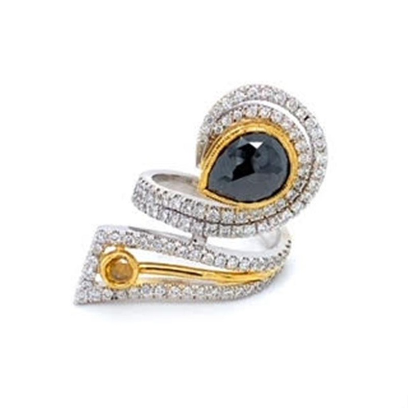 Two-Tone 18K/22K Freeform Double Halo Black and Yellow Diamond Ringone 3.00ct Pear Black Diamondone 0.25ct Round I1 Intense Yellow Diamond109=1.60tw Round G/H SI2 Diamonds