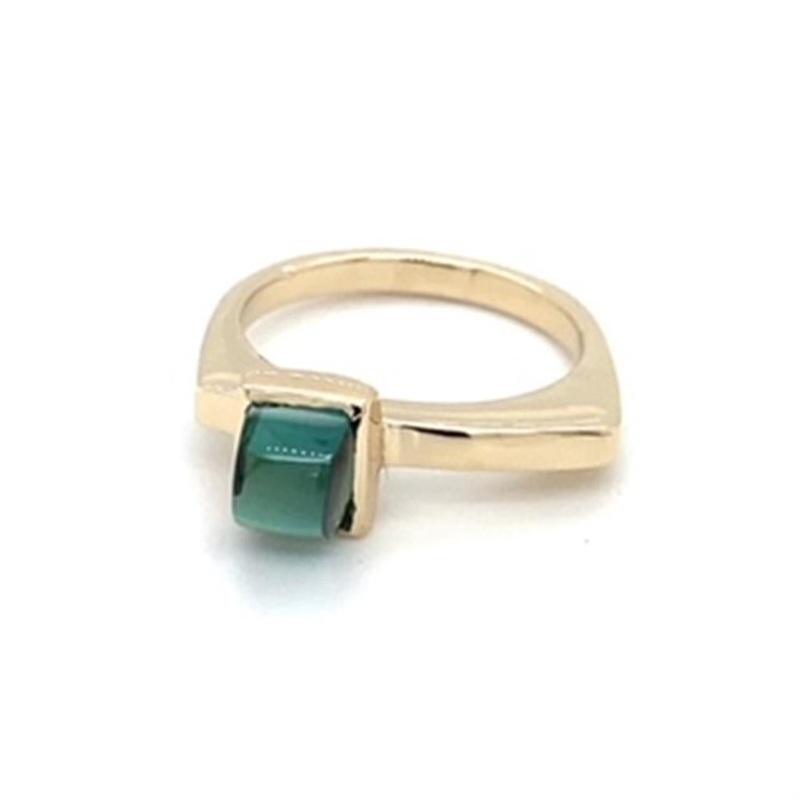 Estate Ladies Stack Ring, squared top with one (1) bezel-set rect cabochon green tourmaline gemstone, 6 x 4.75mm, 14KY, 4.3grams.