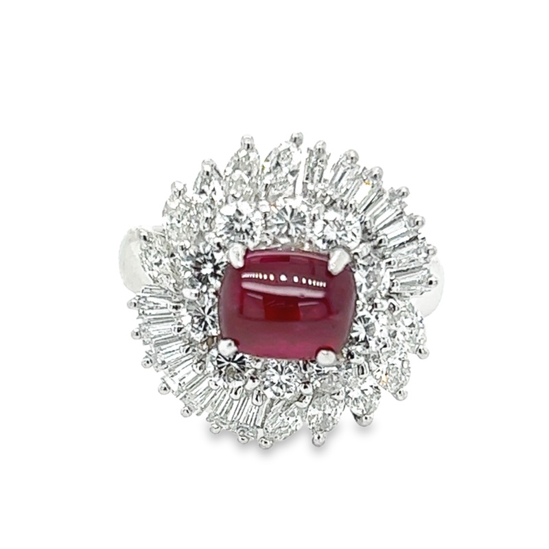 Platinum Cabochon Ruby Cocktail Ring Gia Estate Jewelry Size 5.5 With One 2.01Ct Cabochon Ruby, 10=0.50Tw Round G/H Si1/Si2 Diamonds And 1.32 Twt Other Stones Jewelry Type: Color Fashion