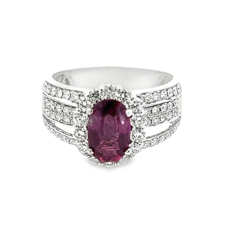 White 14 Karat Estate Cranberry Sapphire and Diamond Halo Ring Estate Jewelry Size 7 With One 1.97Ct Oval Sapphire And 68=1.04Tw Round H/I I2 Diamonds Gram Weight: 6.4 Jewelry Type: Color Fashion