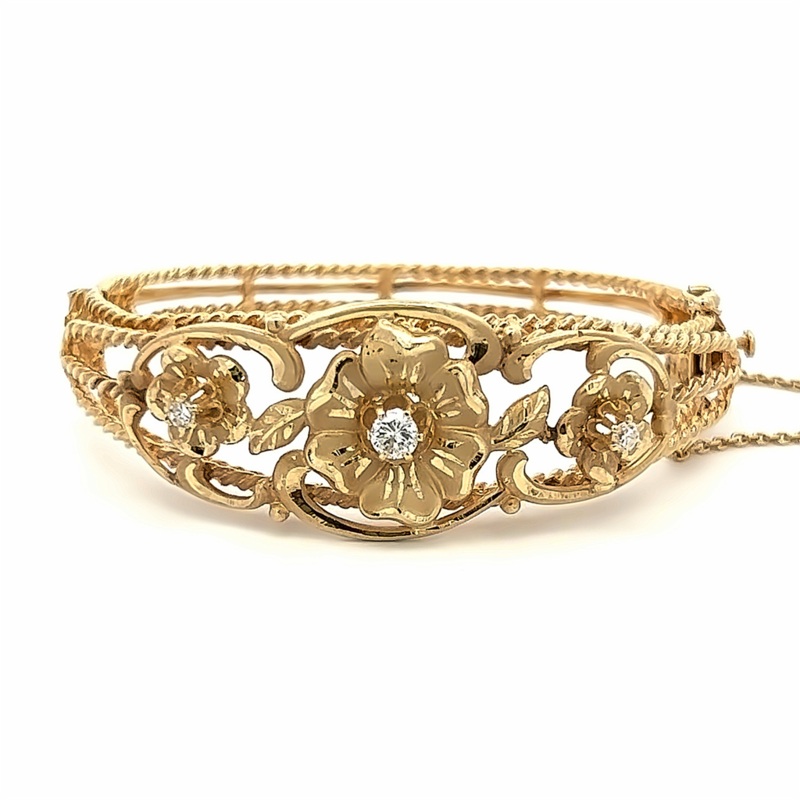 Yellow 14 Karat Diamond Flower Bangle Bracelet Estate Jewelry With 3=0.35Tw European-Cut H/I I1 Diamonds Gram Weight: 22.4