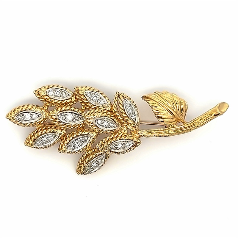 Yellow 18 Karat Leaf Branch Brooch Estate Jewelry With 30=0.40Tw Round G/H Vs1/Vs2 Diamonds Gram Weight: 12.5