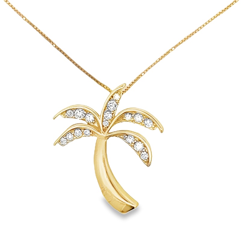 Estate 14 Karat Yellow Gold Diamond Palm Tree Necklace, Length 18, 17=0.57Tw Round H/I Si2/I1 Diamonds, Gram Weight: 5.3