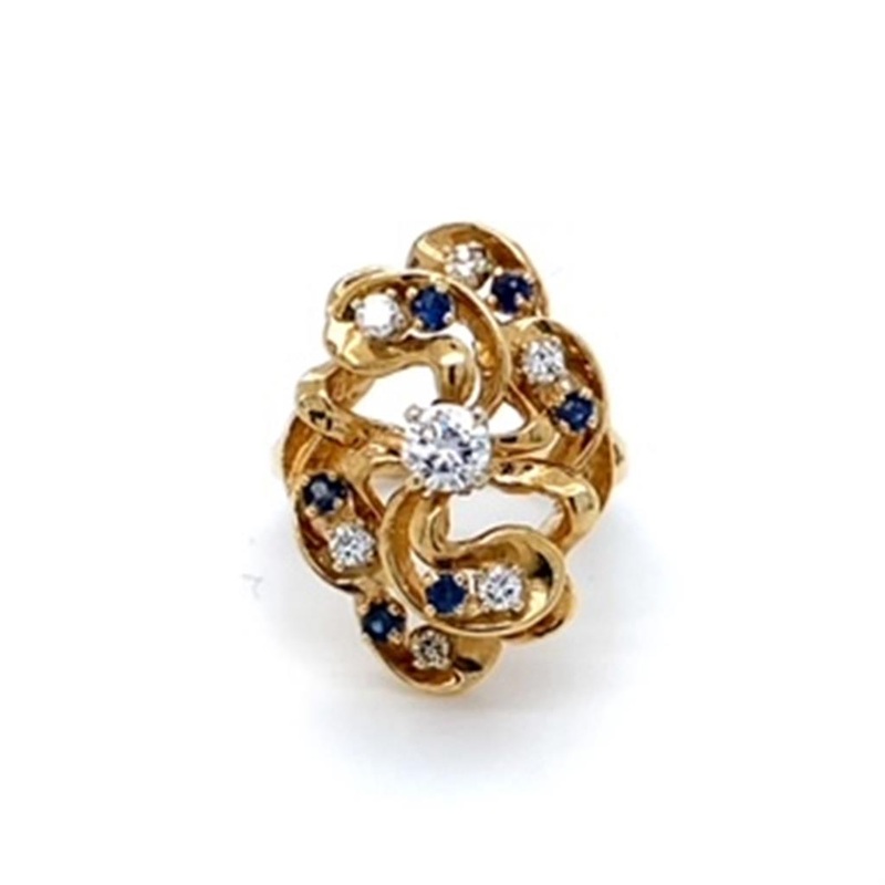 Estate Ladies Freeform Sapphire and Diamond Ring, 14KY, with six round sapphire, six round accent diamonds, and one 1/4ct round center diamond, 6.1grams. Total diamond weight .47ctw.