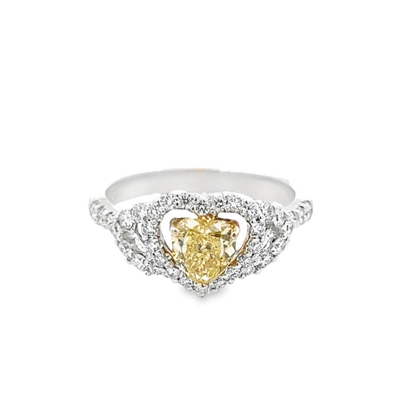 White 18 Karat Heart Shape Yellow Diamond Halo Ring Estate Jewelry Size 8 With One 0.85Ct Heart Vs1/Vs2 Intense Yellow Diamond And 36=0.45Tw Round G/H Si1/Si2 Diamonds Jewelry Type: Diamond Fashion Ring