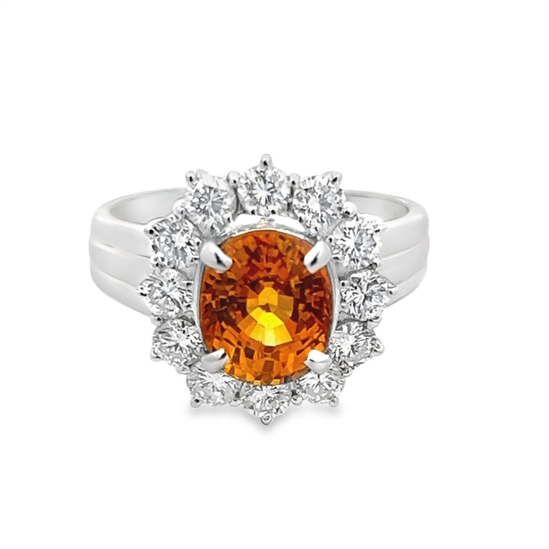 Platinum Orange Sapphire Halo Diamond Ring Estate Jewelry Size 7.5 With One 3.03Ct Oval Orange Sapphire And 12=1.09Tw Round H/I Si1/Si2 Diamonds Gram Weight: 9.7Jewelry Type: Color Fashion