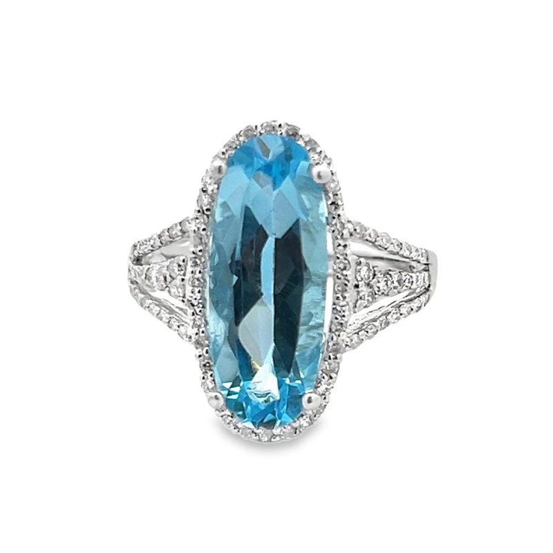 White 14 Karat Oval Blue Topaz Diamond Halo Ring Estate Jewelry Size 6.75 With One 18.00X7.20Mm Oval Blue Topaz And 76 0.38Tw Round H/I I1/I2 Diamonds Gram Weight: 4.6Jewelry Type: Color Fashion