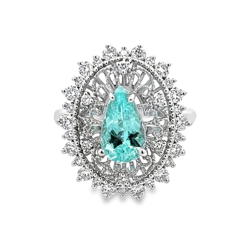 White 14 Karat Paraiba Antique Halo Diamond Ring Estate Jewelry Size 7.5 With One 1.36Ct Pear Pariaba Tourmaline And 34=0.64Tw Round G/H Si1/Si2 Diamonds Gram Weight: 5.34Jewelry Type: Color Fashion
