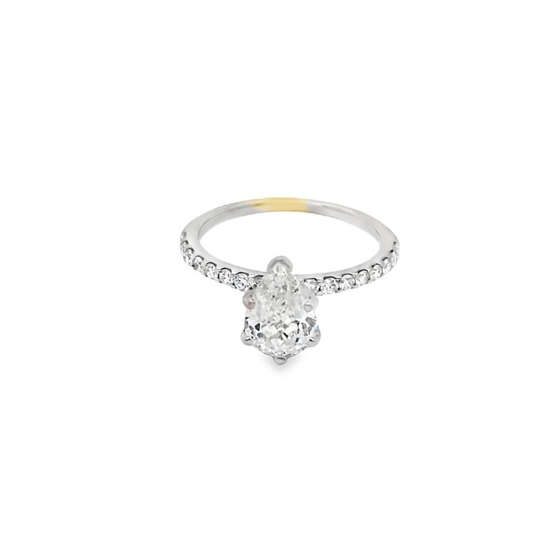 Estate 14 Karat White Gold Prong Set Pear Shape Diamond Engagement Ring, With One = 1.21Ct Pear J Si2 Diamond And 16 = Round H/I Si1/Si2 Diamonds Gram Weight: 2