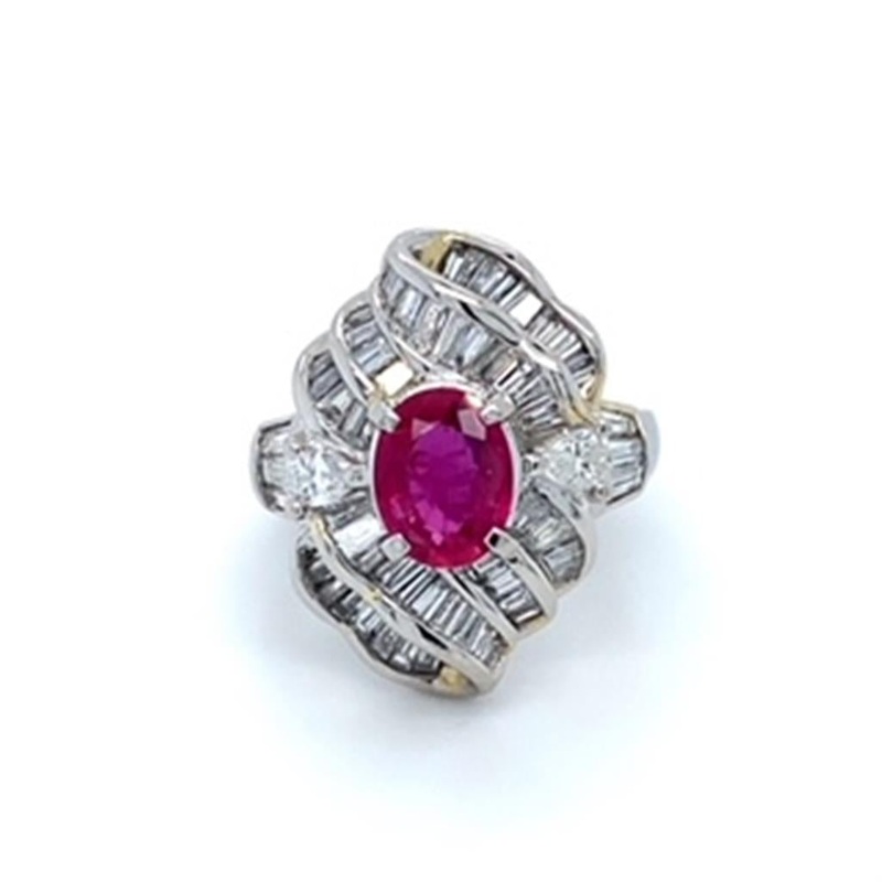 Estate Ruby and Diamond Platinum Fashion Ring containing one (1) oval ruby gemstone, 57 baguette-cut diamonds, two (2) pear-shaped diamonds = 2.30ctwD, 13.0grams, PT900, 13.0grams.