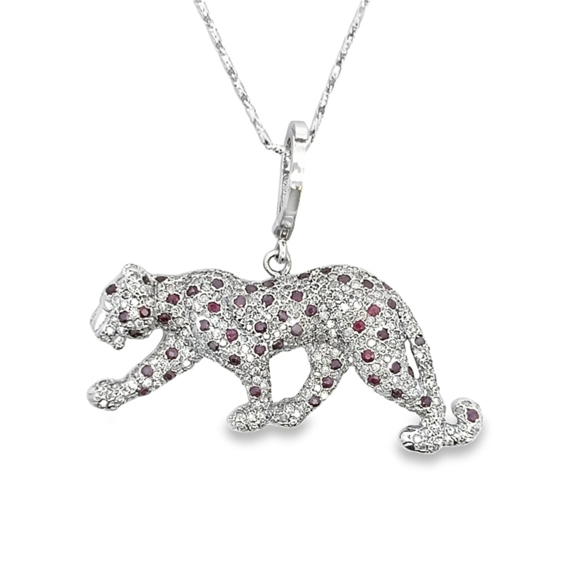 White 14 Karat Ruby & Diamond Panther Pendant Estate Jewelry Length 18 With 50=1.00Tw Round Rubys And 1.00Tw Round H/I I3 Diamonds Gram Weight: 16.5Jewelry Type: Color Fashion
