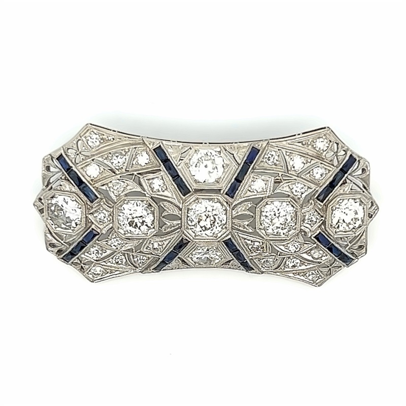 Platinum Sapphire & Diamond Antique Brooch Estate Jewelry With 7=3.07Tw European-Cut I/J I1 Diamonds, 26=0.65Tw Round I/J I1 Diamonds And 1.2 Twt Other Stones Gram Weight: 13.3