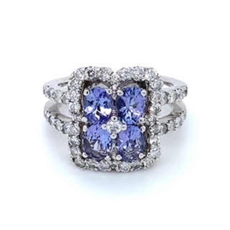 Estate Ladies Tanzanite and Diamond Rectangular Halo, split shank fashion ring, 5.3gr, 14KWfour 5x4mm oval tanzanite 2.4ctw zoisite, light lavender48 diamonds 1.5-2mm = 1.20ctw Diamond I1/HI