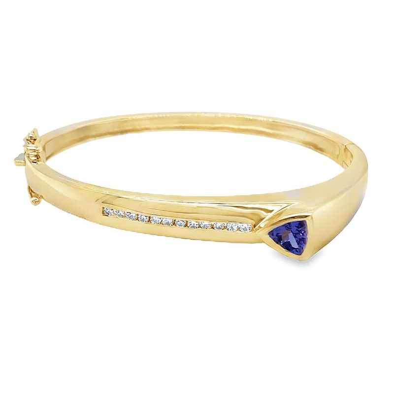 Estate 14 Karat Yellow Gold Trillion Tanzanite And Diamond Bangle Bracelet, With One = 1.19Ct Trillion Tanzanite And 12 = 40.00Tw Round G/H Si1/Si2 Diamonds, Gram Weight: 28.8