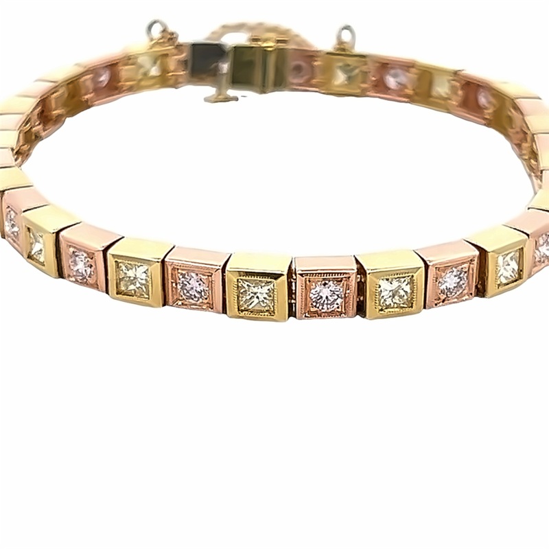 Two-Tone 18 Karat Fancy Light Pink & Yellow Diamond Bracelet Estate Jewelry Length 7.25 With 17=1.19Tw Round I1 Pink Diamonds And 17=2.55Tw Princess Cut I1 Yellow Diamonds Gram Weight: 26.4Jewelry Type: Diamond Fashion