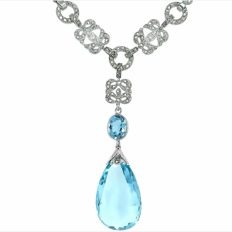 White Platinum Ant Aqua Dia Neck Estate Jewelry Length 20 one 20.00ct Briolette Aqua one 2.00ct Oval Aqua 110=1.00tw Combo – Multiple Shapes F/G VS1/VS2 Diamonds Jewelry Type: Antique Fashion