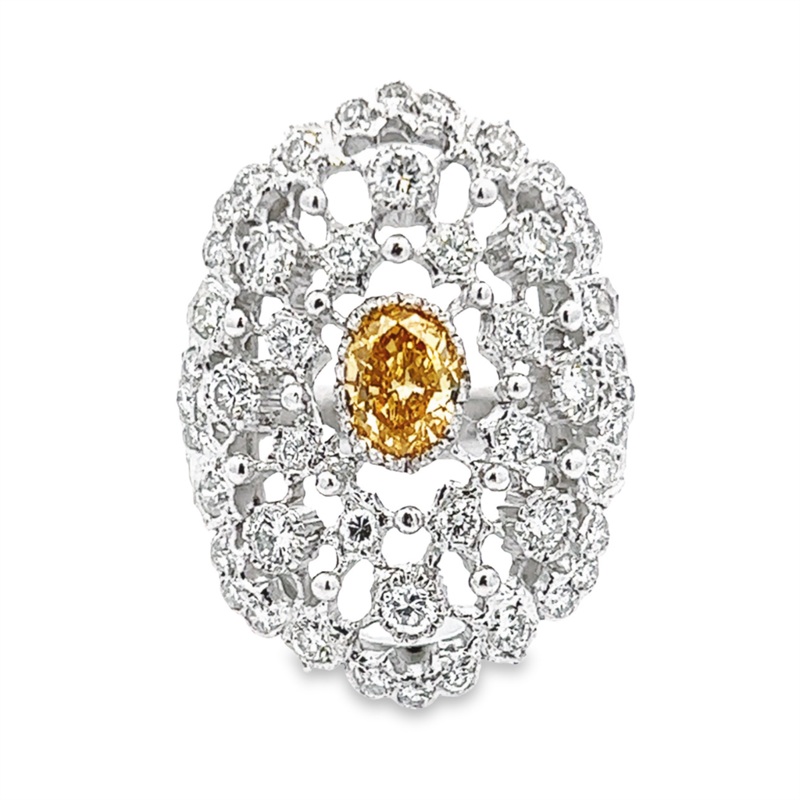 Yellow 18 Karat Yellow & White Diamond Filagree Ring Estate Jewelry Size 6 With One 0.53Ct Oval Si1 Intense Yellow Diamond And 67=1.25Tw Round G/H Si1/Si2 Diamonds Gram Weight: 9.7Jewelry Type: Diamond Fashion
