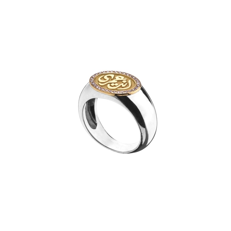 TheEternity Chevalier Ring is made from18kt Gold and Sterling Silver, and is adorned with calligraphy and diamonds.The is ring engraved with the most popular verse sung by Egypts voice Umm Kulthum in 1964. " " Youre my eternity Words by Ahmed Shafik Kamel,
