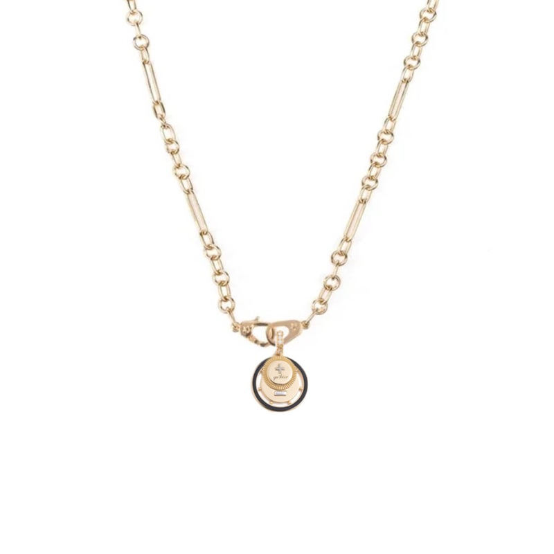 Handcrafted in 18k Yellow Gold, this Small Mixed Clip Sister Hook Chain Necklace Story represents Ever Growing Love. + – The plus and minus signs, in combination with two French phrases: Qu’hier, Que Demain translate as today more than yesterday and less than tomorrow. Symbolic of ever-growing love, a larger heart, and the accumulation of memories of a treasured life. Inspired by the poem leternelle Chanson written in 1889 by Rosamonde Gerard. The necklace is composed of our small mixed clip chain and anchored to the chain are sister hooks that fit perfectly intertwined with each other.