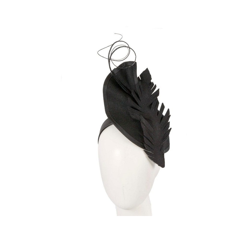 Exclusive black winter racing fascinator created in Melbourne by our experienced milliners. Pure wool felt base decorated with felt leaf and curly feathers. Perfect choice for your next autumn or winter racing meting. Made in Australia Exclusive design Ren