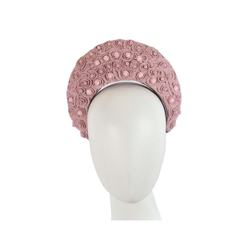 Modern dusty pink headband, hand-blocked from sinamay and covered in luxurious lace. Made in Australia by Cupids Millinery Melbourne