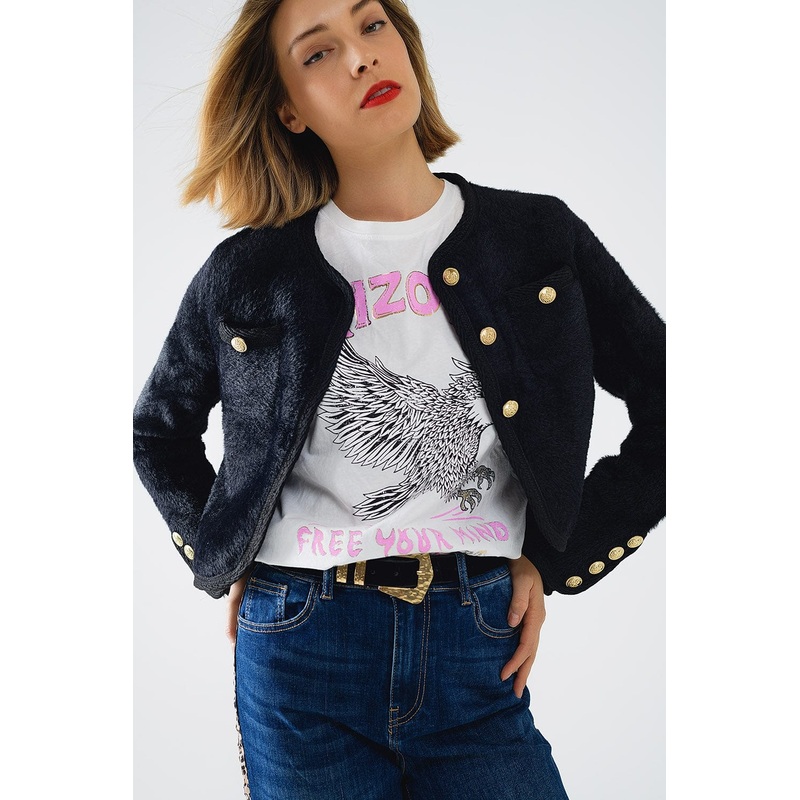 This extra soft, fluffy high-quality cardigan in black is a luxurious and versatile addition to your wardrobe. The ultra-soft and fluffy knit fabric ensures a cozy, comfortable feel, while the sleek black color adds timeless elegance. Gold buttons on the sleeves and pockets elevate the design with a touch of sophistication, making this cardigan perfect for both casual and more refined looks.