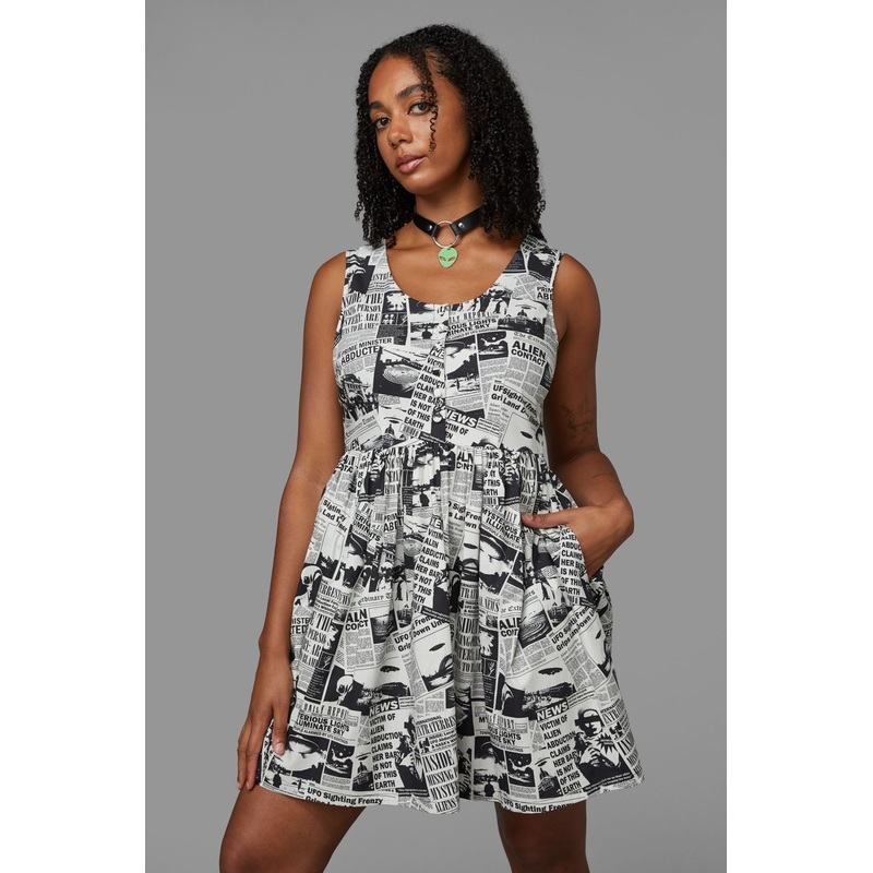 Graphic Printed Dress-Features 'Extraterrestrial' Print-Fit And Flare Cut-Sleeveless Upper Bodice-Gathered & Flared Skirt-Made From Cotton-Available In Cream & Purple ColourwaysProduct Code: BGFX099