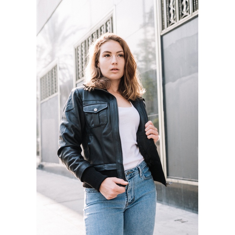 Women's leather bomber jacket. Soft, supple leather lambskin. Rib on waistline, neckline, and wrists Four pockets: two side and two chest Zippered midsection 100% genuine leather This women's leather bomber is perfect for everyday wear. It has a relaxed, c