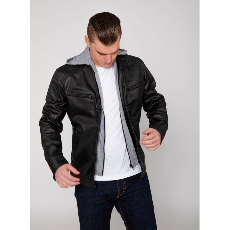 The Butch. Heavy patchwork and details on the shoulders makes this puppy a badass biker/moto jacket look.Made with high quality0.6 mm PU Faux Leather.Removable hoodgiveyou 2-in-1 versatility, allowing you to wear a hood when you want.All seasons jacket.SPE