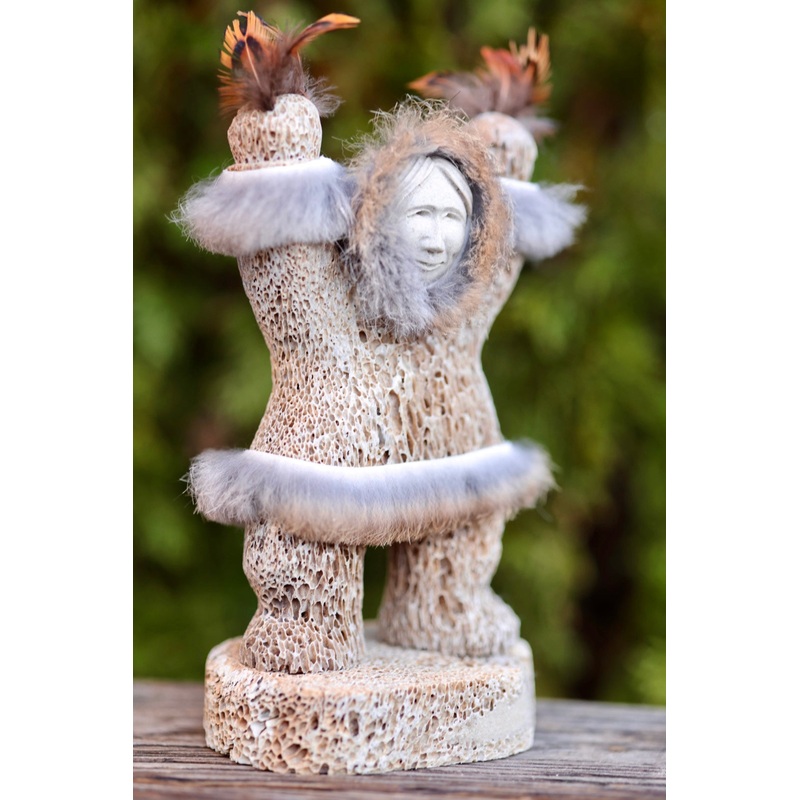 Whale Bone Carving on stand with Antler Face-Signed by Artist, made in Alaska-Trimmed with Rabbit FurSize - 8 1/2"H x 4"W* Shipping within USA only