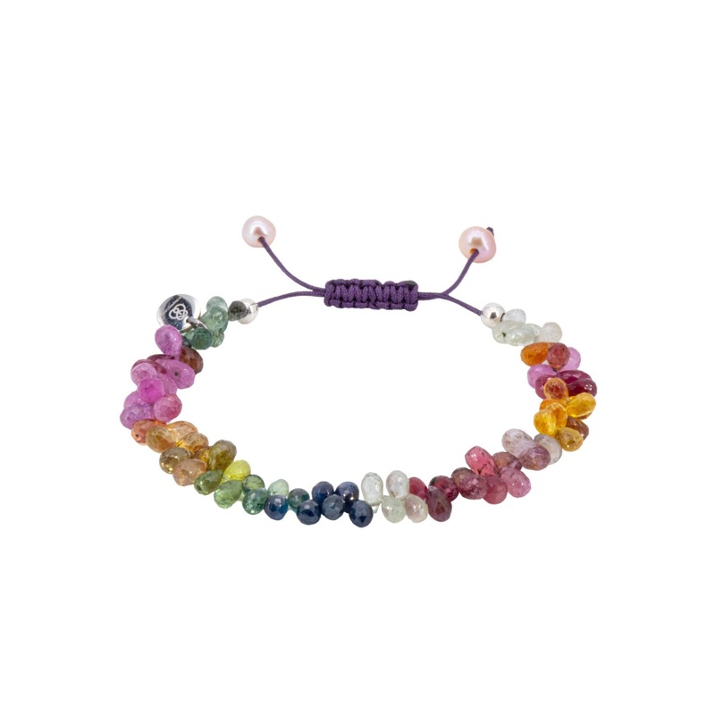 TheFantasy Bracelet ismade from many different colour drop shape sapphires with two pink freshwater pearls at the end of the purple Shamballa drawstring closure.As an aluminium oxide, the sapphire is one of the energetic stones, and is available in almost