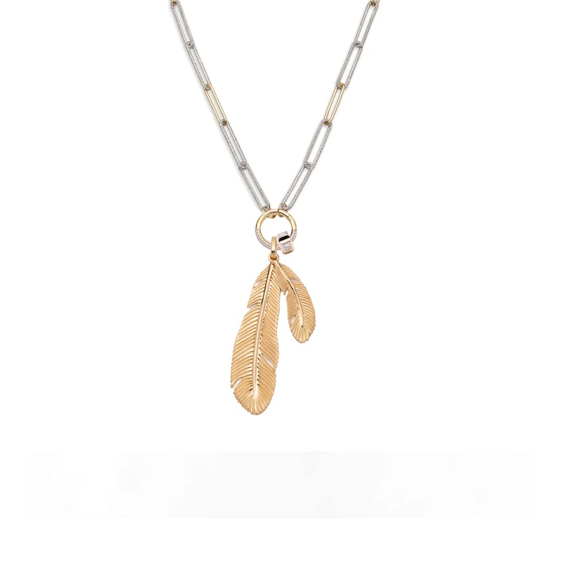 Handcrafted in 18k yellow gold, our Feather Extended Clip Open Chain Necklace Story features a 22″ Extended Clip Open Chain with ten pav diamond links. The pav Annex Link opens to hold two Feather Pendants and a True Love Princess Cut Heart Beat. Our Feather Pendants represent the Latin word vivacitas, or life force. The vivacity tenet encourages us to live a life filled with exploration, discovery, and learning. The feather symbolizes wings, inspiring us to take flight and soar in spite of our doubts and fears. If not now, when?