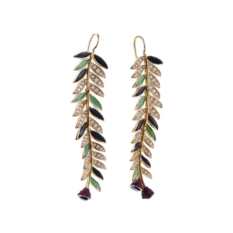 The Festive Treasures Yew Tree Earrings aremade from ethically and sustainably sourced18k gold, featuring white diamonds, black diamonds and rubies. Theminiature enamel detail has been hand painted on these beautiful earrings.Part of Basak Baykal’sFestive Treasures Collection. Meet with a very special capsule collection for the Festival Treasures! It allows you to spend every day in a festive mood with uniquely created sculpture-like jewellery that awakens the festive spirit in every heart, not just for the winter season. Inspired by the pine tree, the most meaningful symbol of the new year, as well as the Yew Tree and Holly Tree, which are included in the collection and evoke the new year with its red fruit, the collection carries a timeless heritage with its colours and designs.