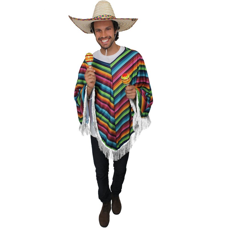 Tiempo de fiesta!Get the tequila and tacos ready because you're going to have a mighty Mexican time in this Fiesta Fun Poncho! This poncho is printed in an array of bright colours and features a white fringed hem. Perfect for any Mexican or International t