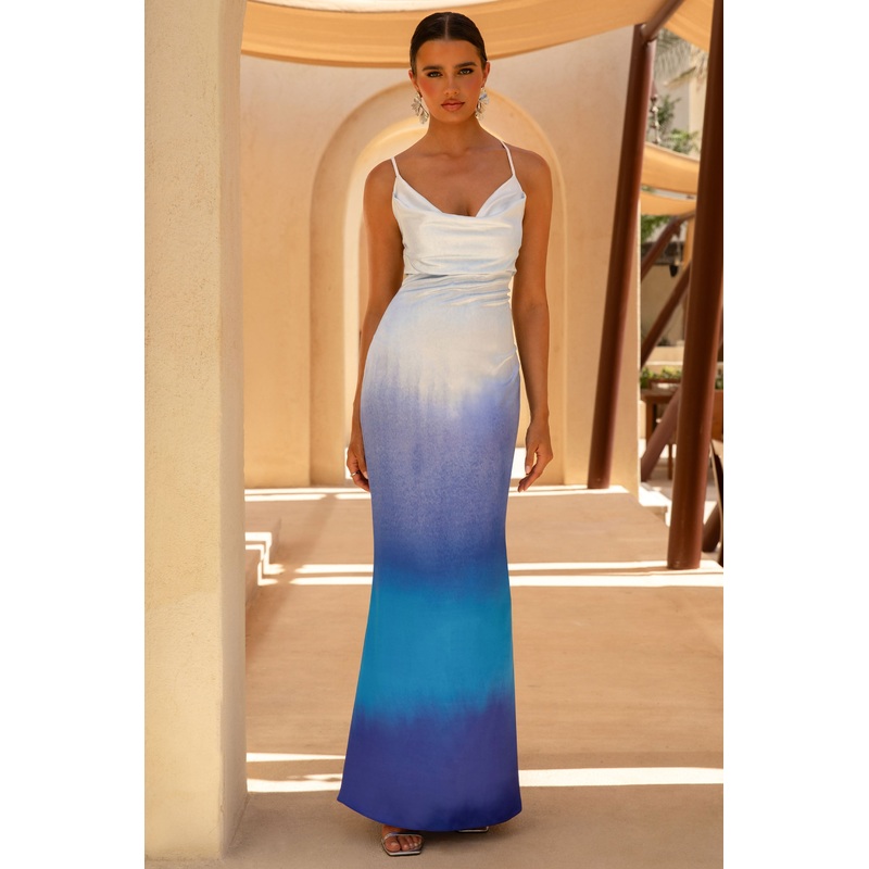 Fiji | Blue Ombre Satin Cowl-Neck Strappy Maxi Dress