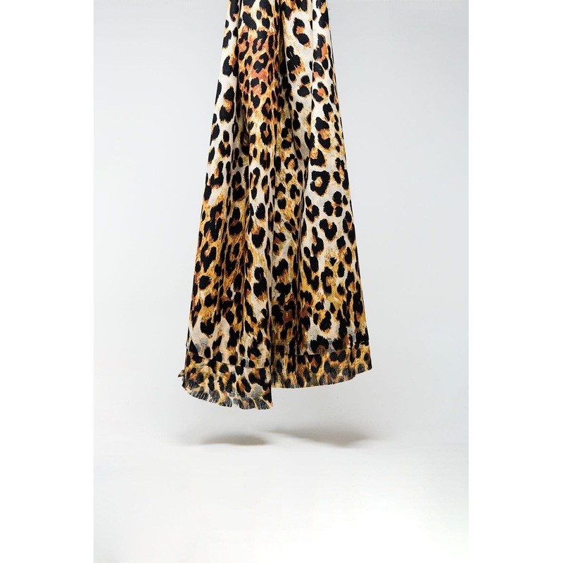 The model is wearing size U, ensuring a comfortable and universally flattering fit. This fine knit woven scarf with a camel leopard print is an essential addition to your wardrobe, providing effortless style with a touch of wild sophistication.