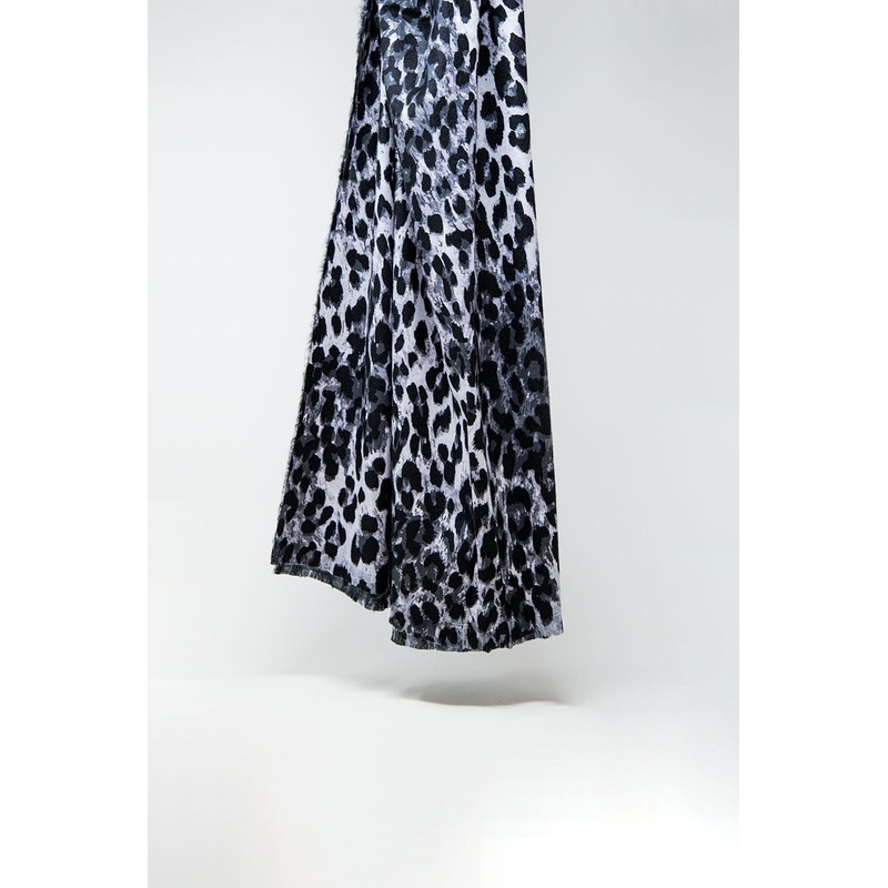 The model is wearing size U, which provides a universally flattering fit. This fine woven scarf with its stylish grey leopard print is a must-have accessory for anyone looking to add a subtle yet striking element to their wardrobe.