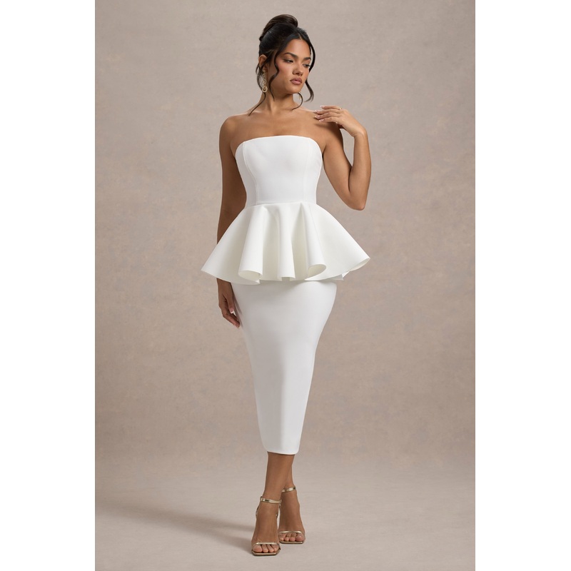 Opt for opulence in First Dance, our sophisticated midi dress. Designed in our premium scuba crepe and scuba foam in a timeless white shade, this strapless midi is defined by a peplum waistline that creates unexpected dimension and drama. Perfect for glam