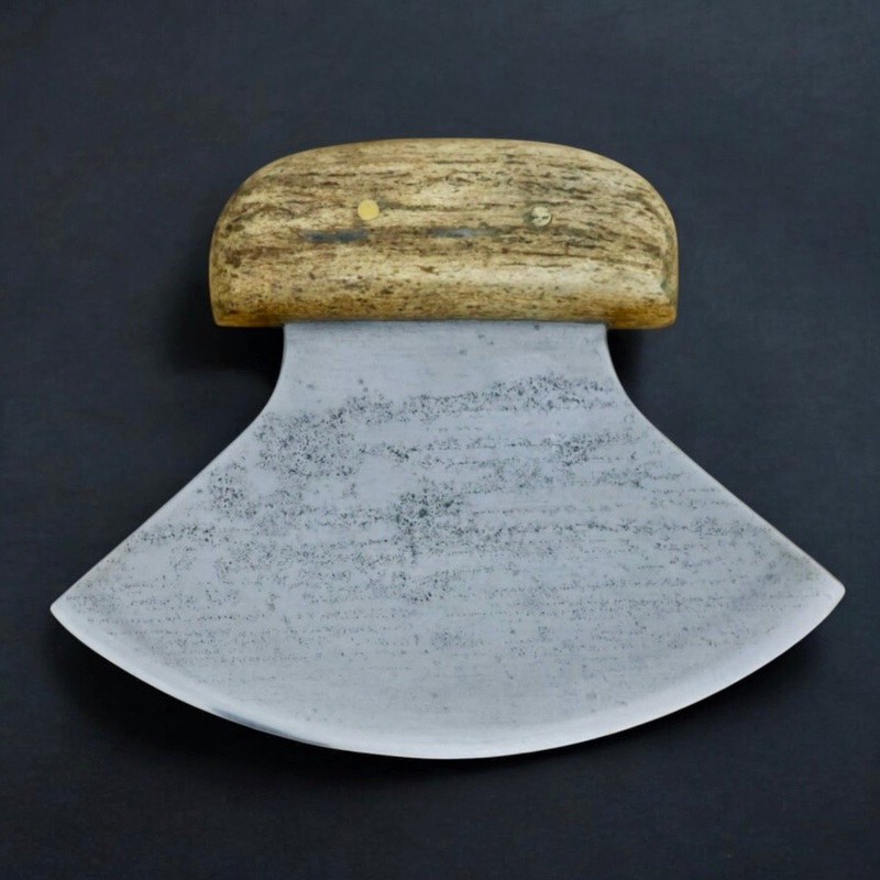 Steller's Sea Cow Bone Handle Ulu Knife Sold individually*Maynard Linder Ulu Knives are handmade in Homer, Alaska from carpenters' handsaw steel with a high carbon content. This type of steel is preferred for its lightness, flexibility and ability to take