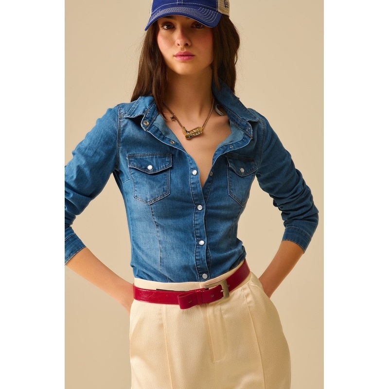Tailored and timeless, this fitted stretch denim shirt brings sleek structure to your everyday wardrobe. Designed to hug the body in all the right places, it features a bodycon silhouette that highlights your shape without sacrificing comfort. The classic polo collar and long sleeves lend polish, while chest pockets and pressure buttons add both function and style to this refined essential.