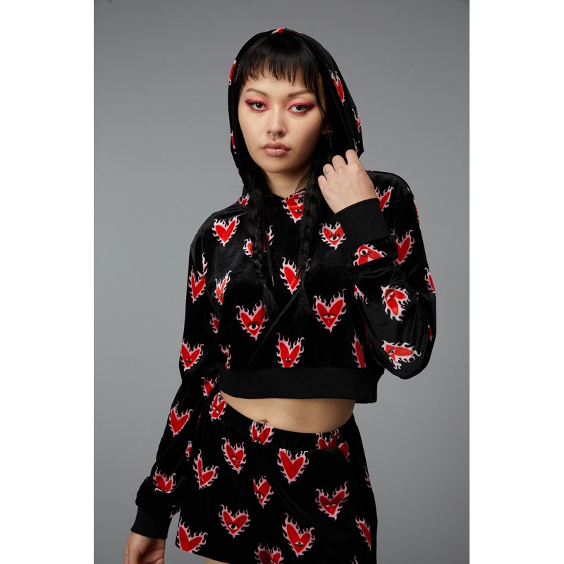 Velvet Jumper- All-Over 'Flamin Hearts' Print- Cropped Length- Rib Fabric At Sleeves Hems And Body Hem- Lined Hood At Neckline- Made From Polyester Velour- Available In BlackProduct Code: BGFV035114