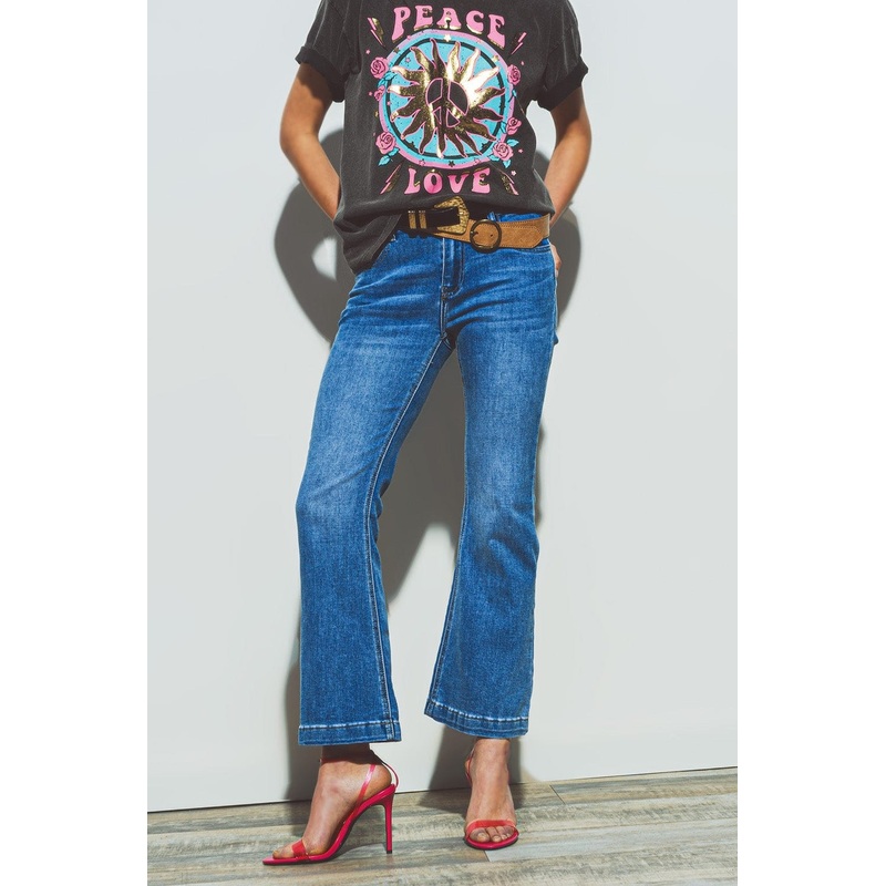 Step into timeless style with our flared double-button waist jeans in classic blue denim. These high-waisted jeans feature a flattering flare design that elongates your silhouette, making them a must-have addition to your wardrobe. The double-button detail