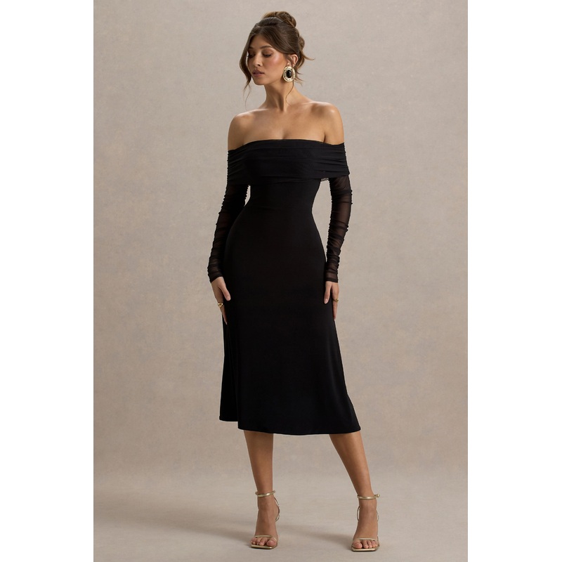 Flatter Me | Black Bardot Midi Dress With Mesh Sleeves