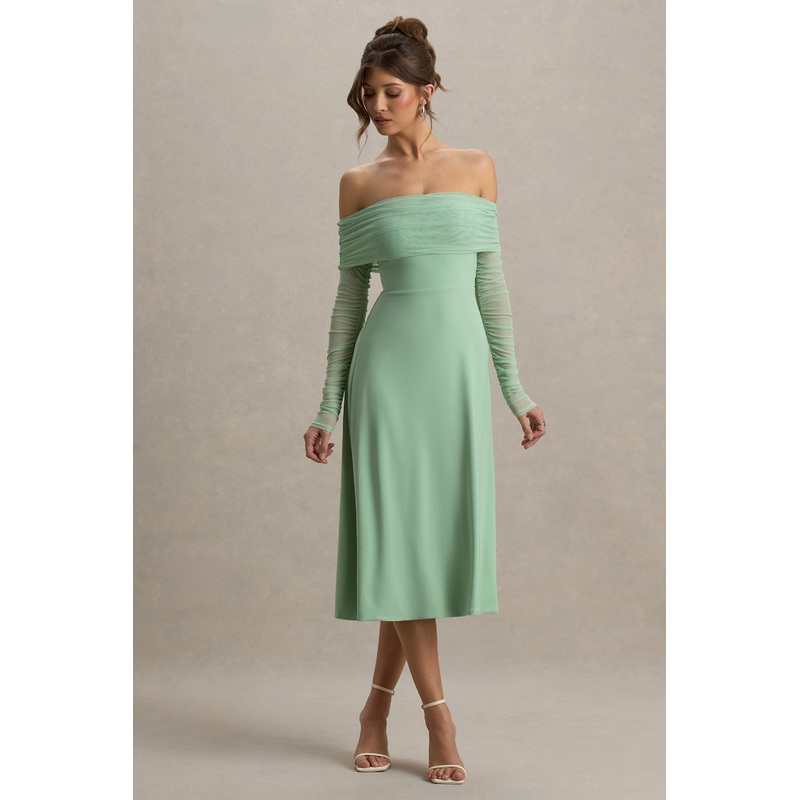 Introducing Flatter Me, the epitome of timeless, romantic elegance with a modern edge. Crafted in a rich light green hue of our premium stretch jersey that skims over your figure for a flattering finish, and delicate mesh long sleeves for a touch of allure. The bardot neckline frames the shoulders whilst delicately displaying the decolletage, bringing an element of captivating charm and lure. Designed to make you feel utterly flawless from every angle, from date nights to black tie events in this piece you will be a vision of grace.