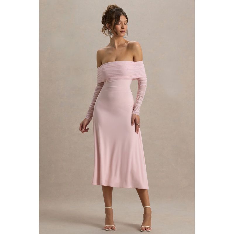 Flatter Me | Light Pink Bardot Midi Dress With Mesh Sleeves